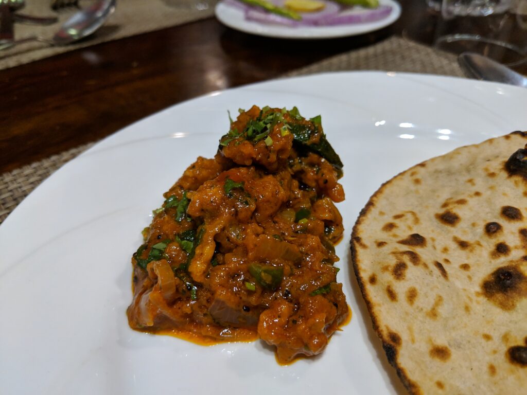 Bhindi Rajasthani: It had only a few okras which were cut into long pieces. Along with that, there was gathiya which were added to the gravy. The gravy had yogurt. The taste was very good and unique. It was more of a general fish rather than the okra dish as the flavor was okra was totally overpowered by the gravy. 4/5 on taste.